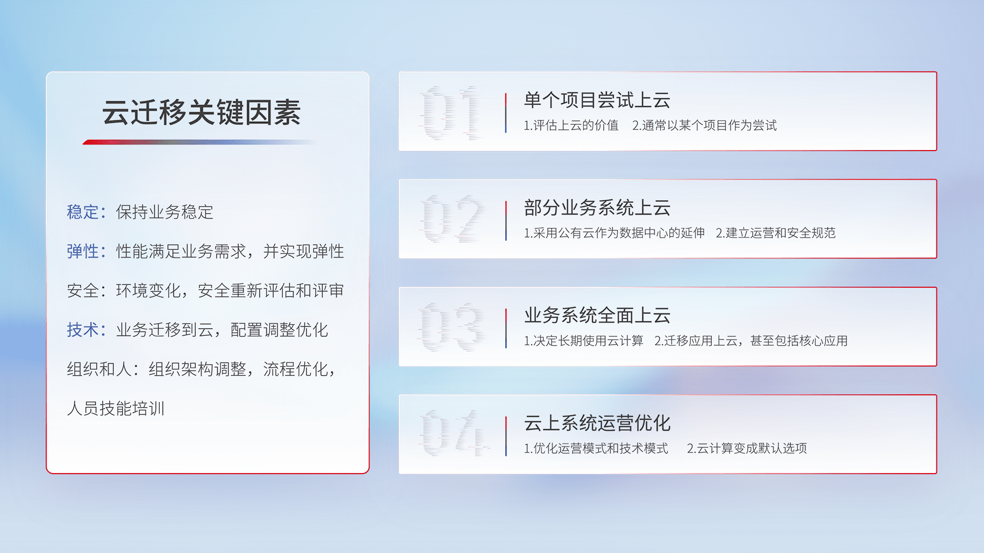 结合实际业务,,从规划设计、、、、云平台选型、、、、云原生改造、、数据迁移、、、集成交付,,,,迁移全过程为客户识别最佳上云路径,,,,做好风险识别管理,,,设计网络架构、、、身份权限、、安全审计合规、、、、操作审计、、日志审计、、、、监控告警策略、、多站点容灾设计等,,,对云上基础设施进行整体规划,,,提升IT治理水平,,,以满足弹性、、、、高可用、、高性能的需求。。