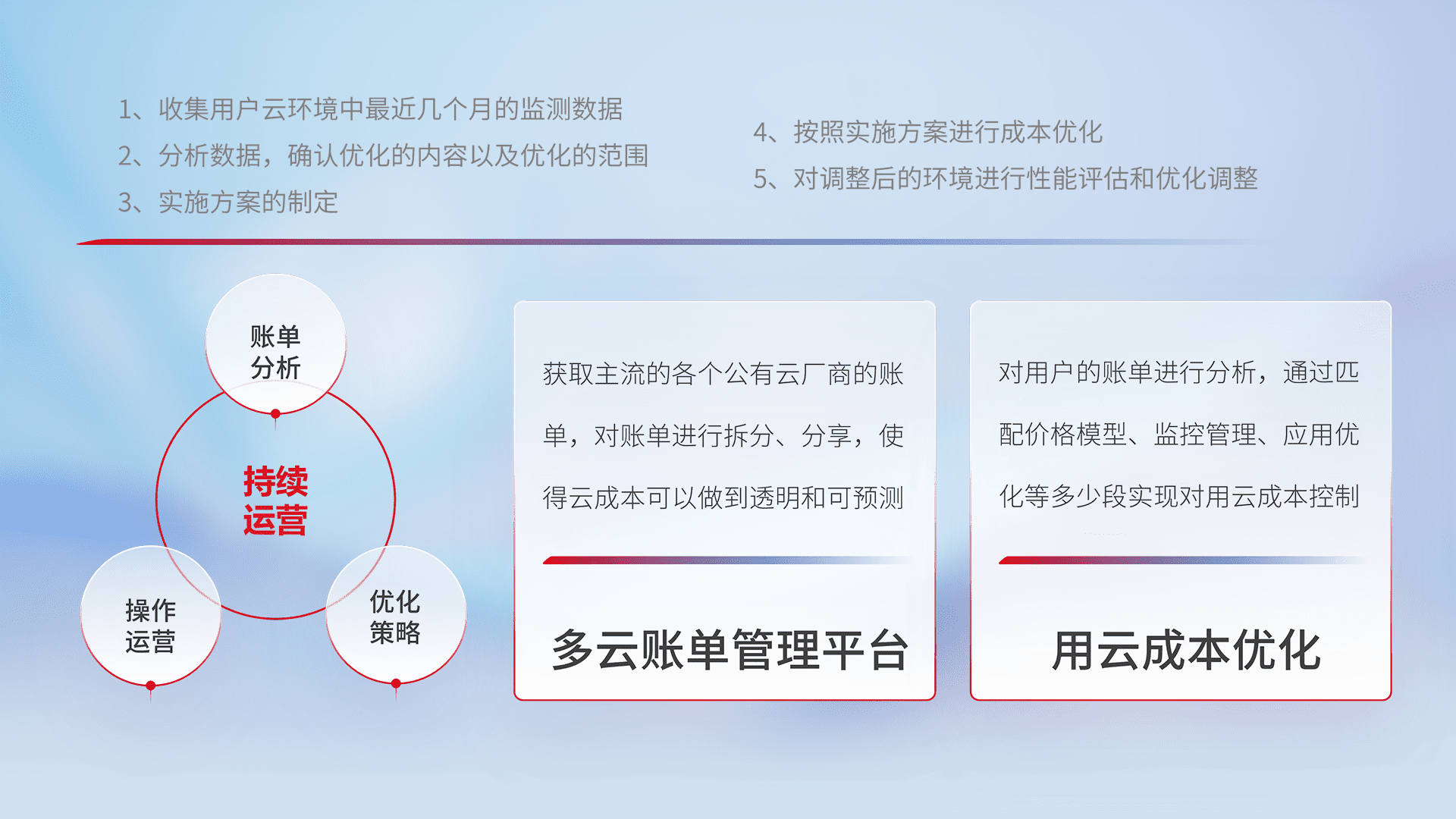 通过多云纳管,,以统一的资源数据模型把客户的云资源进行抽象和封装,,,,进而实现对多云资源的统一操作,,,保障云资源管理的可靠性、、、、稳定性与可用性。。。。量身定制化运维内容,,配置、、、、开发运维、、、、补丁管理、、备份、、、监控、、、、认证和访问管理、、、审计和日常巡检等,,保障在用云过程中的可靠度,,稳定度以及高可用率。。